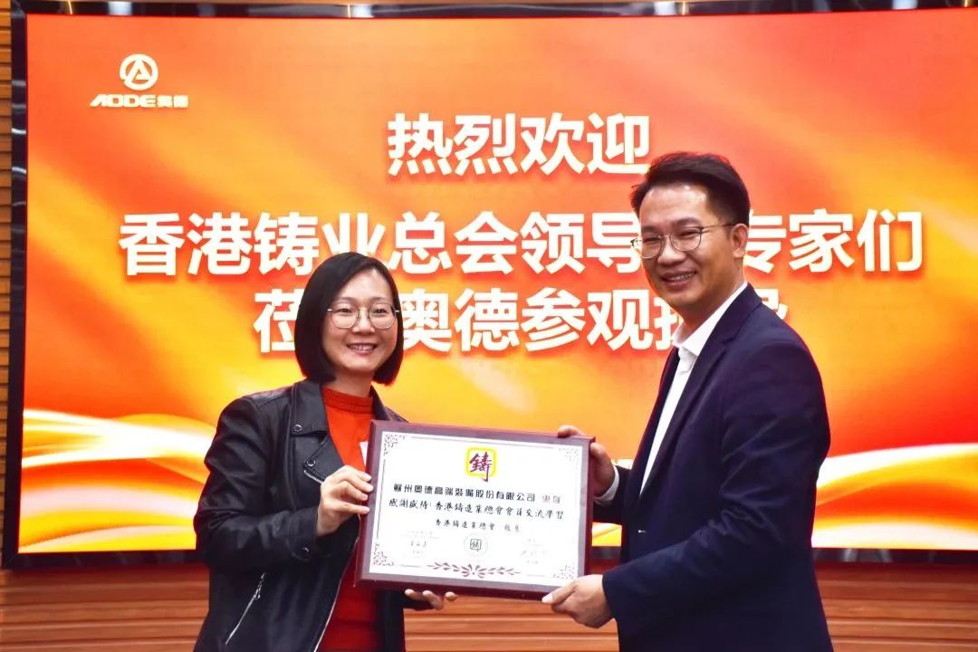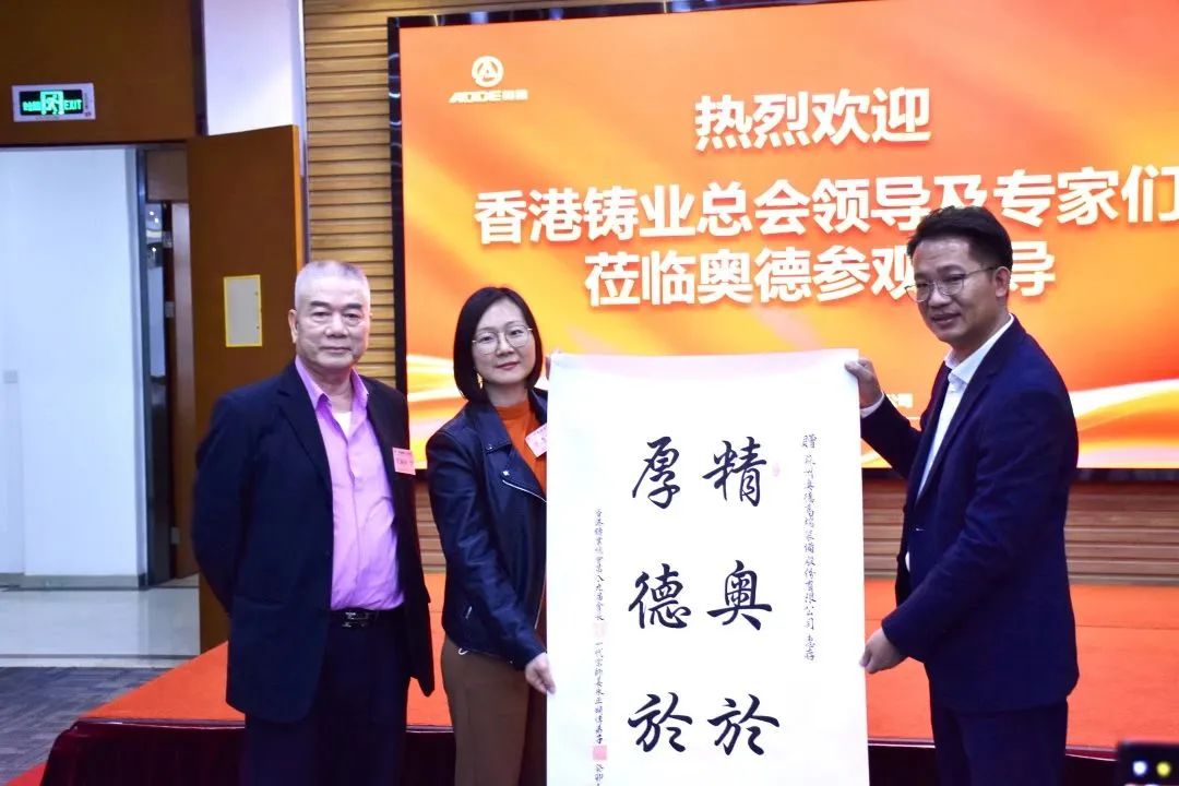 此外,梁詩雅女士代表香港鑄造業(yè)總會贈予奧德香港鑄造業(yè)總會會員交流紀念牌,并將由梁煥操先生親筆題寫的“精奧于品,厚德于心”墨寶贈予奧德,同時,奧德黃文欽先生代表奧德感謝香港鑄造業(yè)總會、高要壓鑄協(xié)會一直以來的關(guān)注與支持。